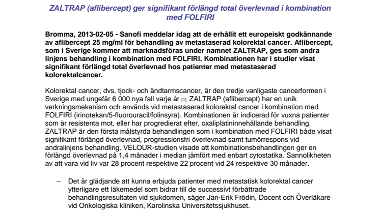 Bromma, 2013-02-05 - Sanofi meddelar idag att de erhållit ett europeiskt godkännande av aflibercept 25 mg/ml för behandling av metastaserad kolorektal cancer. Aflibercept, som i Sverige kommer att marknadsföras under namnet ZALTRAP, ges som andra linjens behandling i kombination med FOLFIRI. Kombinationen har i studier visat signifikant förlängd total överlevnad hos patienter med metastaserad kolorektalcancer.