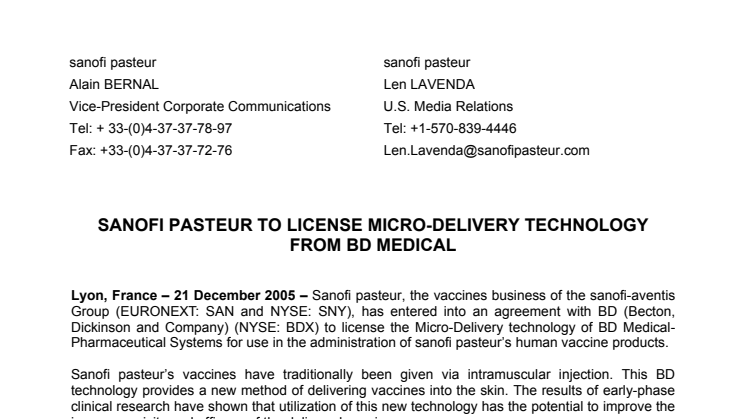 Lyon, France 21 December 2005 Sanofi pasteur, the vaccines business of the sanofi-aventis Group (EURONEXT: SAN and NYSE: SNY), has entered into an agreement with BD (Becton, Dickinson and Company) (NYSE: BDX) to license the Micro-Delivery technology of BD Medical-Pharmaceutical Systems for use in the administration of sanofi pasteurs human vaccine products.