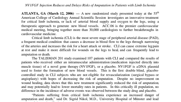 NV1FGF Injection Reduces and Delays Risks of Amputation in Patients with Limb Ischemia