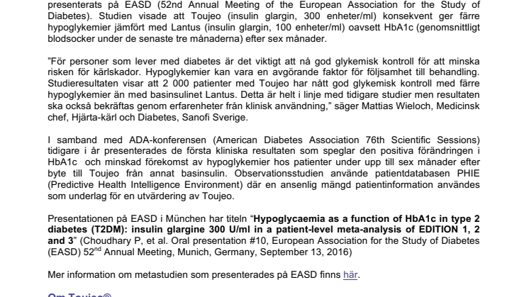 ”För personer som lever med diabetes är det viktigt att nå god glykemisk kontroll för att minska risken för kärlskador. Hypoglykemier kan vara en avgörande faktor för följsamhet till behandling. Studieresultaten visar att 2 000 patienter med Toujeo har nått god glykemisk kontroll med färre hypoglykemier än med basinsulinet Lantus. Detta är helt i linje med tidigare studier men resultaten ska också bekräftas genom erfarenheter från klinisk användning,” säger Mattias Wieloch, Medicinsk chef, Hjärta-kärl och Diabetes, Sanofi Sverige.
