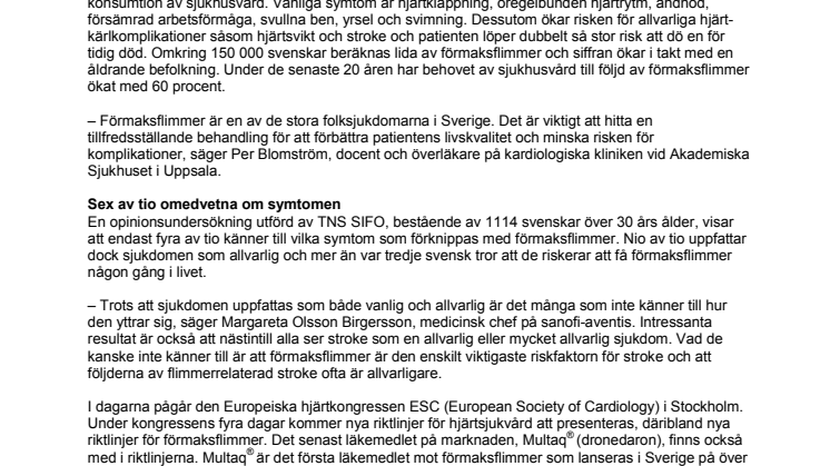 En opinionsundersökning utförd av TNS SIFO, bestående av 1114 svenskar över 30 års ålder, visar att endast fyra av tio känner till vilka symtom som förknippas med förmaksflimmer. Nio av tio uppfattar dock sjukdomen som allvarlig och mer än var tredje svensk tror att de riskerar att få förmaksflimmer någon gång i livet.