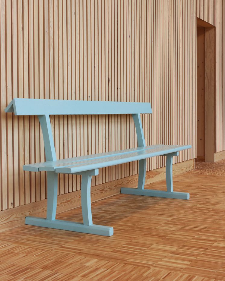 Återbruk är en röd tråd i Sara kulturhus. Ett exempel är gamla fina kyrkbänkar från Mjövattnets bönhus. Bänkarna har slipats och fått ny färg och har hittat sin nya plats.