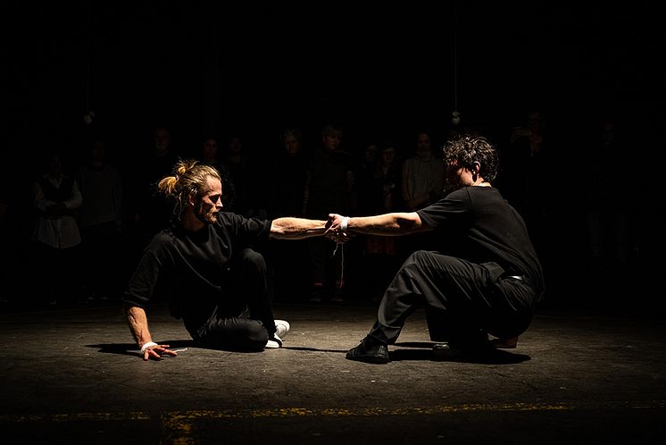 Inspirerade av baltisk dans och folkmusik bjuder Erik Eriksson och Krišjānis Sants in oss att följa med i deras snurrande värld. Hand i hand spinner de över golvet i en konstant växelverkan av tillit och spänning. Som en roterande vattenvirvel splittrar de publiken ena stunden, för att i nästa dra oss samman i ett gemensamt flöde.
