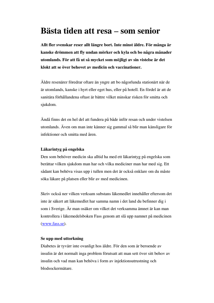 Allt fler svenskar reser allt längre bort. Inte minst äldre. För många är kanske drömmen att fly undan mörker och kyla och bo några månader utomlands. För att få ut så mycket som möjligt av sin vistelse är det klokt att se över behovet av medicin och vaccinationer.