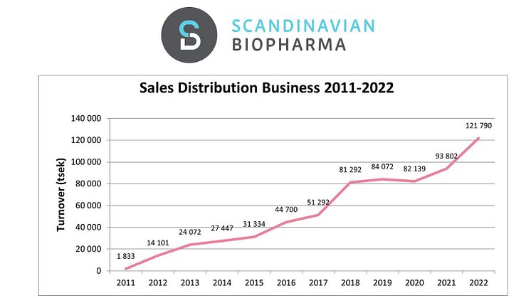 Vår distributionsverksamhet, som består av ett brett sortiment av biologiska specialistläkemedel med fokus på vacciner och immunglobuliner,fortsatte under 2022 sin tillväxtresa med god lönsamhet. Vi slog nytt omsättningsrekord och ökade från 93,8 MSEK 2021 till 121,8 MSEK 2022. Tillväxten drevs både av lanseringar av nya produkter och geografisk expansion.