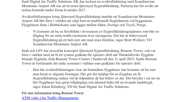 Försvars- och säkerhetsföretaget Saabs och Luftfartsverkets (LFV) nyligen etablerade bolag, Saab Digital Air Traffic Solutions AB, har tecknat en avsiktsförklaring med Scandinavian Mountains Airport AB om att leverera fjärrstyrd flygtrafikledning. Parterna har för avsikt att teckna kontrakt under första kvartalet 2017.
