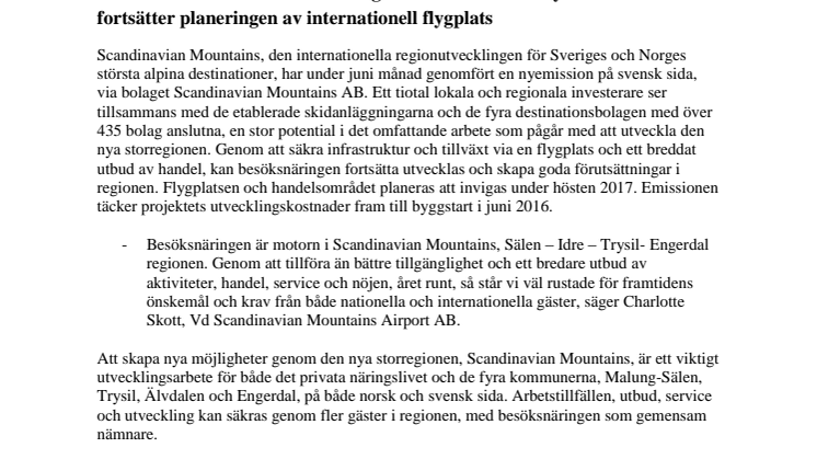 Scandinavian Mountains, den internationella regionutvecklingen för Sveriges och Norges största alpina destinationer, har under juni månad genomfört en nyemission på svensk sida, via bolaget Scandinavian Mountains AB. Ett tiotal lokala och regionala investerare ser tillsammans med de etablerade skidanläggningarna och de fyra destinationsbolagen med över 435 bolag anslutna, en stor potential i det omfattande arbete som pågår med att utveckla den nya storregionen. Genom att säkra infrastruktur och tillväxt via en flygplats och ett breddat utbud av handel, kan besöksnäringen fortsätta utvecklas och skapa goda förutsättningar i regionen. Flygplatsen och handelsområdet planeras att invigas under hösten 2017. Emissionen täcker projektets utvecklingskostnader fram till byggstart i juni 2016.