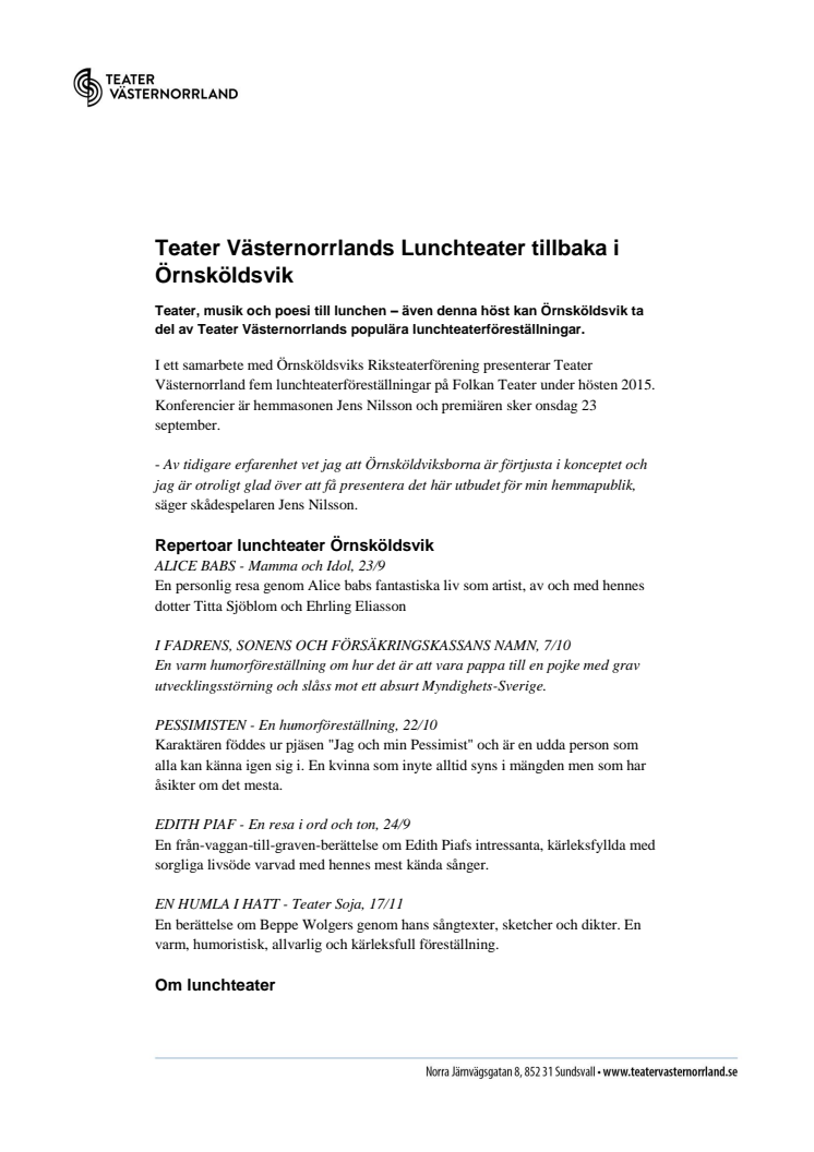 I ett samarbete med Örnsköldsviks Riksteaterförening presenterar Teater Västernorrland fem lunchteaterföreställningar på Folkan Teater under hösten 2015. Konferencier är hemmasonen Jens Nilsson och premiären sker onsdag 23 september.