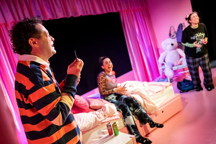 Andreas Ferrada-Noli, Sepideh Khodarahmi och Ellen Hennig Öhrström i Teater Västernorrlands föreställning Festen.