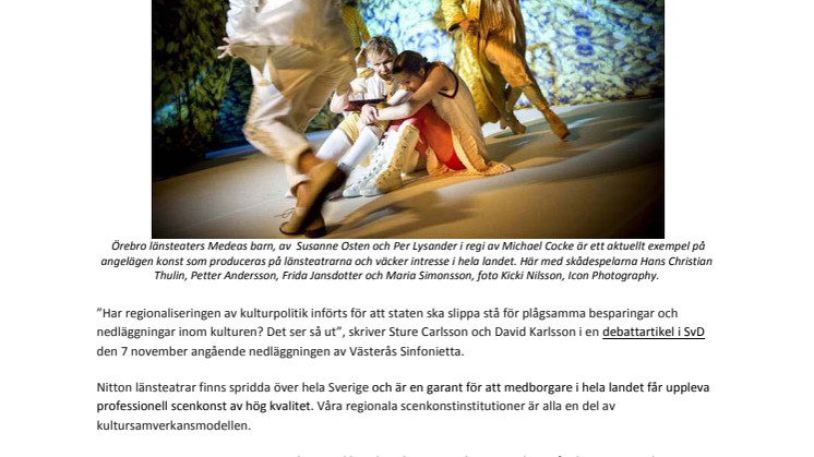 "Nitton länsteatrar finns spridda över hela Sverige och är en garant för att medborgare i hela landet får uppleva professionell scenkonst av hög kvalitet. Våra regionala scenkonstinstitutioner är alla en del av kultursamverkansmodellen.”Har regionaliseringen av kulturpolitik införts för att staten ska slippa stå för plågsamma besparingar och nedläggningar inom kulturen? Det ser så ut”, skriver Sture Carlsson och David Karlsson i en debattartikel i SvD den 7 november angående nedläggningen av Västerås Sinfonietta.