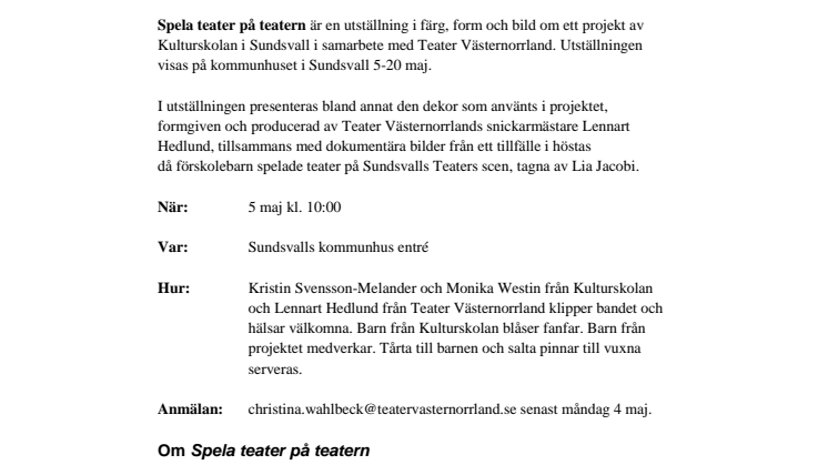 Spela teater på teatern är en utställning i färg, form och bild om ett projekt av Kulturskolan i Sundsvall i samarbete med Teater Västernorrland. Utställningen visas på kommunhuset i Sundsvall 5-20 maj.
