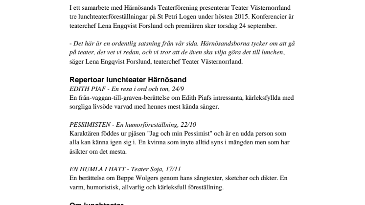 I ett samarbete med Härnösands Teaterförening presenterar Teater Västernorrland tre lunchteaterföreställningar på St Petri Logen under hösten 2015. Konferencier är teaterchef Lena Engqvist Forslund och premiären sker torsdag 24 september.
