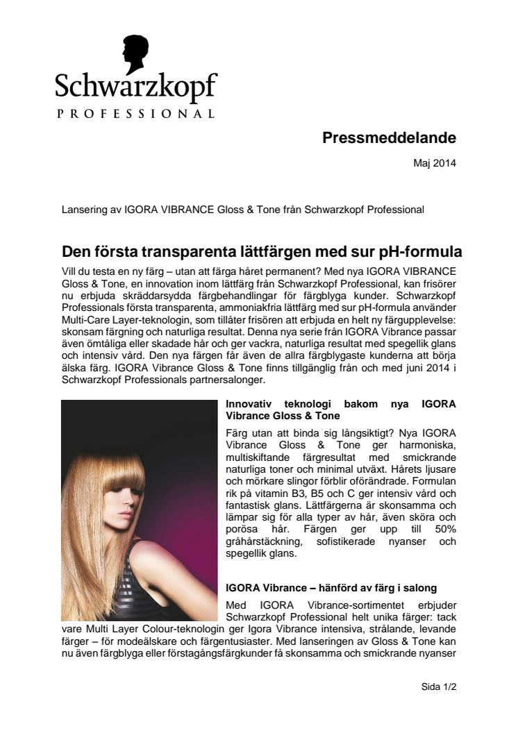 Med nya IGORA VIBRANCE Gloss & Tone, en innovation inom lättfärg från Schwarzkopf Professional, kan frisörer nu erbjuda skräddarsydda tjänster för färgblyga kunder som vill ha en skonsam färgning och naturliga resultat. Schwarzkopf Professionals första transparenta, ammoniakfria lättfärg med sur pH-formula använder Multi-Care Layer-teknologin, som ger en helt ny färgupplevelse.
