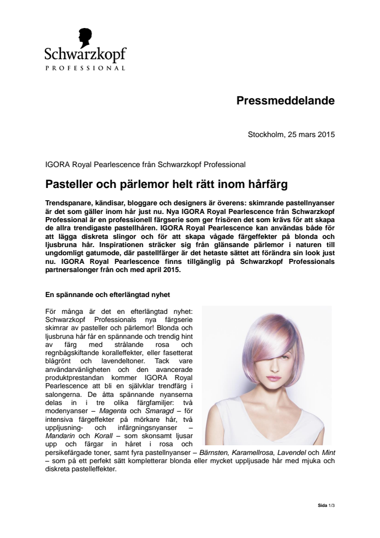 Trendspanare, kändisar, bloggare och designers är överens: skimrande pastellnyanser är det som gäller inom hårfärg just nu. Nya IGORA Royal Pearlescence från Schwarzkopf Professional är en professionell färgserie som ger frisören det som krävs för att skapa de allra trendigaste pastellhåren. Serien finns tillgänglig på Schwarzkopf Professionals partnersalonger från och med april 2015.