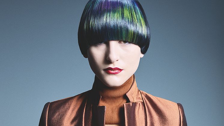 Vassa Lucid Nocturnes Catwalk Look har skapats av Schwarzkopf Professionals färgdirektör för Nordamerika, Rossa Jurenas @rossajurenas. Den har en stark grafisk form och taggiga konturer, och Rossa har skapat regnbågsskimrande lila och blå toner som sätter fokus på luggen för en punkig twist som är totalt förtrollande.