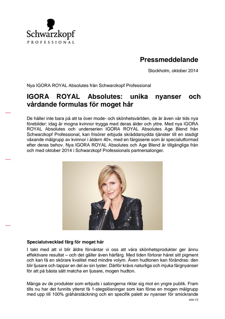 De håller inte bara på att ta över mode- och skönhetsvärlden, de är även vår tids nya förebilder: idag är mogna kvinnor trygga med deras ålder och yttre. Med nya IGORA ROYAL Absolutes och underserien IGORA ROYAL Absolutes Age Blend från Schwarzkopf Professional, kan frisörer erbjuda skräddarsydda tjänster till en stadigt växande målgrupp av kvinnor i åldern 40+, med en färgsserie som är specialutformad efter deras behov. Nya IGORA ROYAL Absolutes och Age Blend är tillgängliga från och med oktober 2014 i Schwarzkopf Professionals partnersalonger.