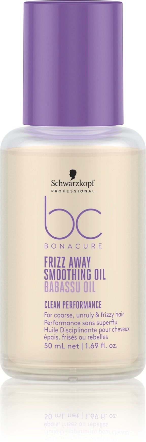 BC Frizz away-serien från Schwarzkopf Professionals BC Clean Performance är framtagen för frissigt och svårhanterligt hår. Den kontrollerar och slätar ut håret samtidigt som den tillför intensiv glans. Den är berikad med den hudvårdsinspirerade ingrediensen Babassu-olja som kommer från Babassu-palmen. Babassu-oljan är rik på vårdande antioxidanter och ger håret en hög fuktbevarande kapacitet. BC Frizz Away består av fem olika produkter för både salongs- och konsumentbruk. De finns likt de andra BC Clean Performance-serierna tillgängliga hos flertalet frisörsalonger landet över och i välrenommerade webshopar.
