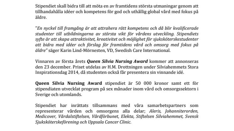 Med anledning av H.M. Drottning Silvias 70-års dag den 23 december innevarande år, instiftar Swedish Care International i samarbete med sina partners ett årligt stipendium riktat till sjuksköterskestudenter vid svenska lärosäten.