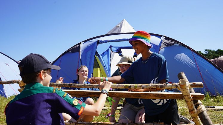 Jamboree22 är också en plats att träffa vänner. Scouterna Elvie Biolcati-Brennan, Hilma Breitholtz, Ida Molander och Erik Hämälä från Tegs scoutkår satsar på att lära känna sina nya grannar.