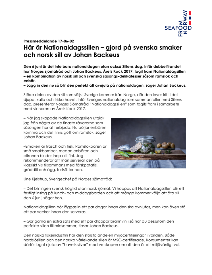 Den 6 juni är det inte bara nationaldagen utan också Sillens dag. Inför dubbelfirandet har Norges sjömatråd och Johan Backeus, Årets Kock 2017, tagit fram Nationaldagsillen – en kombination av norsk sill och svenska säsongs-delikatesser såsom ramslök och enbär.
