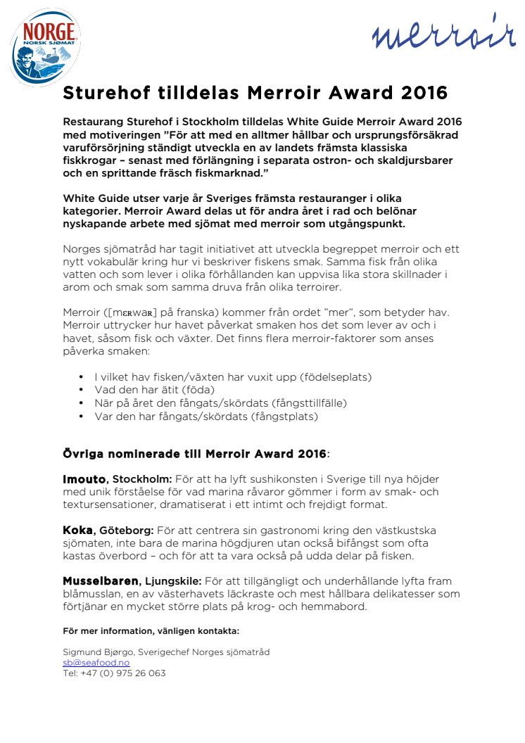 Restaurang Sturehof i Stockholm tilldelas White Guide Merroir Award 2016 med motiveringen ”För att med en alltmer hållbar och ursprungsförsäkrad varuförsörjning ständigt utveckla en av landets främsta klassiska fiskkrogar – senast med förlängning i separata ostron- och skaldjursbarer och en sprittande fräsch fiskmarknad.”