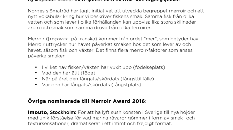 Norges sjömatråd har tagit initiativet att utveckla begreppet merroir och ett nytt vokabulär kring hur vi beskriver fiskens smak. Samma fisk från olika vatten och som lever i olika förhållanden kan uppvisa lika stora skillnader i arom och smak som samma druva från olika terroirer.