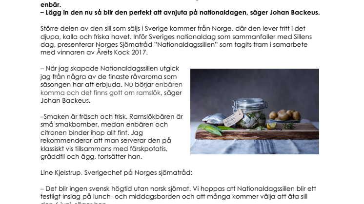 Den 6 juni är det inte bara nationaldagen utan också Sillens dag. Inför dubbelfirandet har Norges sjömatråd och Johan Backeus, Årets Kock 2017, tagit fram Nationaldagsillen – en kombination av norsk sill och svenska säsongs-delikatesser såsom ramslök och enbär.