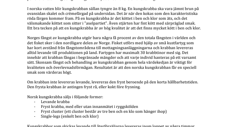 Rå norsk kungskrabba är en välsmakande råvara där man kan koka klorna och servera krabban som den är. Krabbköttet kan användas på många olika sätt och passar perfekt för både stekning och grillning.