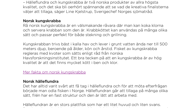 – Hälleflundra och kungskrabba är två norska produkter av allra högsta kvalitet, och det ska bli oerhört spännande att se vad de kreativa finalisterna väljer att tillaga, säger Line Kjelstrup, Sverigechef Norges sjömatråd.