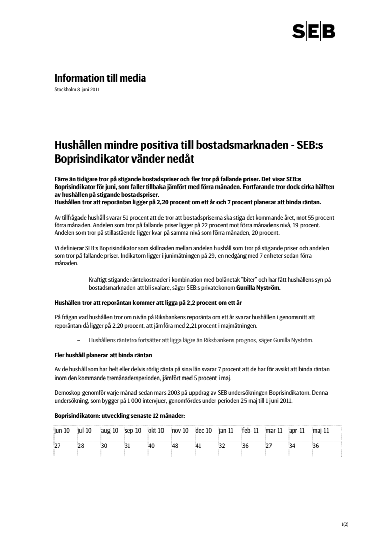 Hushållen mindre positiva till bostadsmarknaden - SEB:s Boprisindikator vänder nedåt
