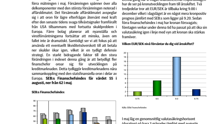 Syftet med SEB:s Finanschefsindex, som publiceras för tjugoandra gången, är att fånga klimatförändringar i den finansiella miljön och underlätta förståelsen för den ekonomiska och finansiella utvecklingen. Hela rapporten finns tillgänglig på www.sebgroup.com\press.