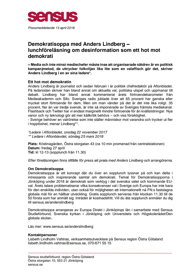 Temat för Demokratisopporna i Jönköping under 2018 är demokrati som verktyg i det svenska valet och kommande EU-val. Anders Lindberg är journalist och politisk chefredaktör på Aftonbladet. På ledarsidan skriver han bland annat om aktuella val, politiska utspel och uppmanar till debatt. Den 27 april kommer han till Jönköping för att prata om desinformation som ett hot mot demokratin.