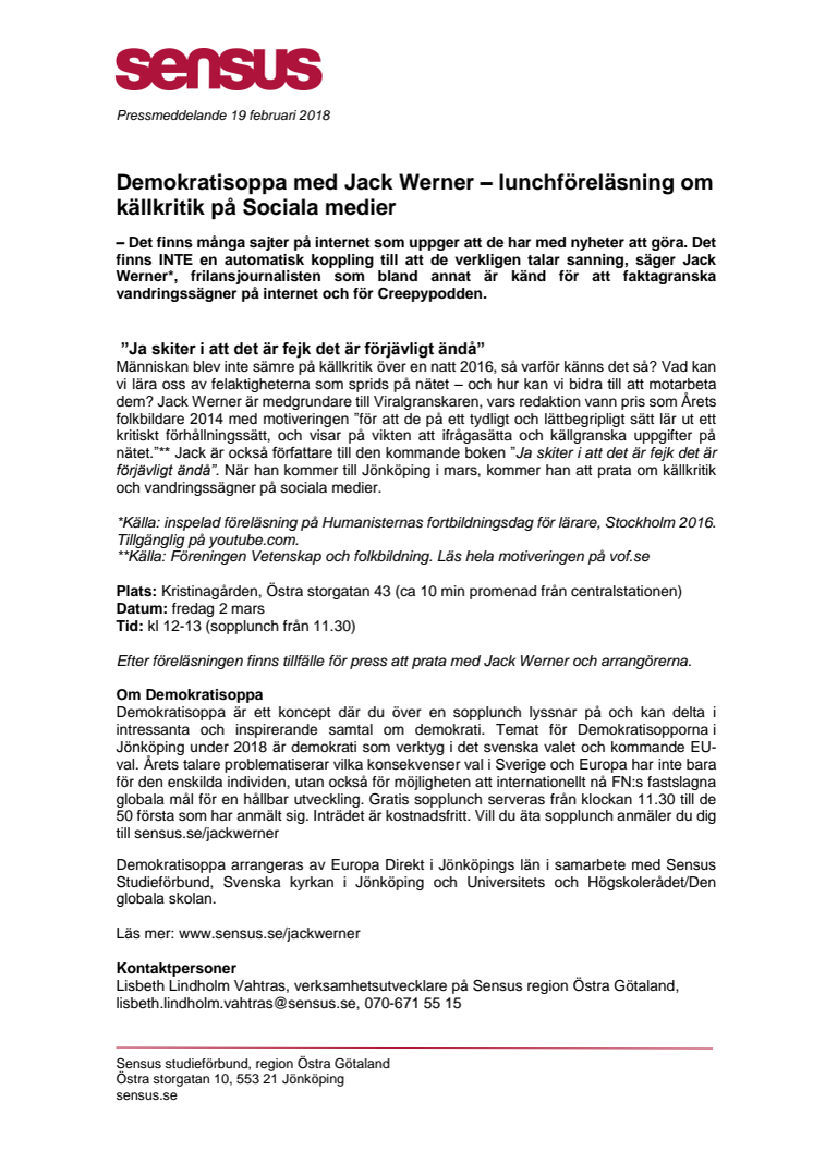 Demokratisoppa med Jack Werner – lunchföreläsning om källkritik på Sociala medier