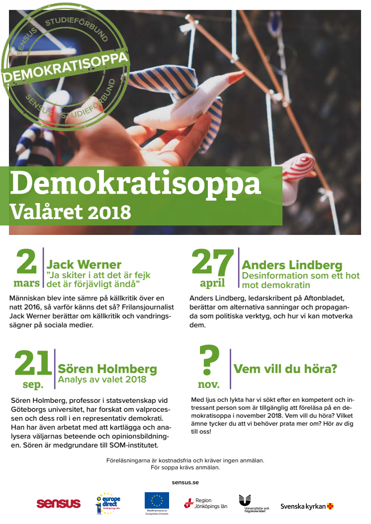 2018 är det val i Sverige. Demokratisoppa bjuder in till intressanta föreläsningar och samtal som på olika vis anknyter till valet samt läget i Europa. 2018 gästas Demokratisoppa av bland andra Jack Werner, frilansjournalist, och Sören Holmberg, professor i statsvetenskap.