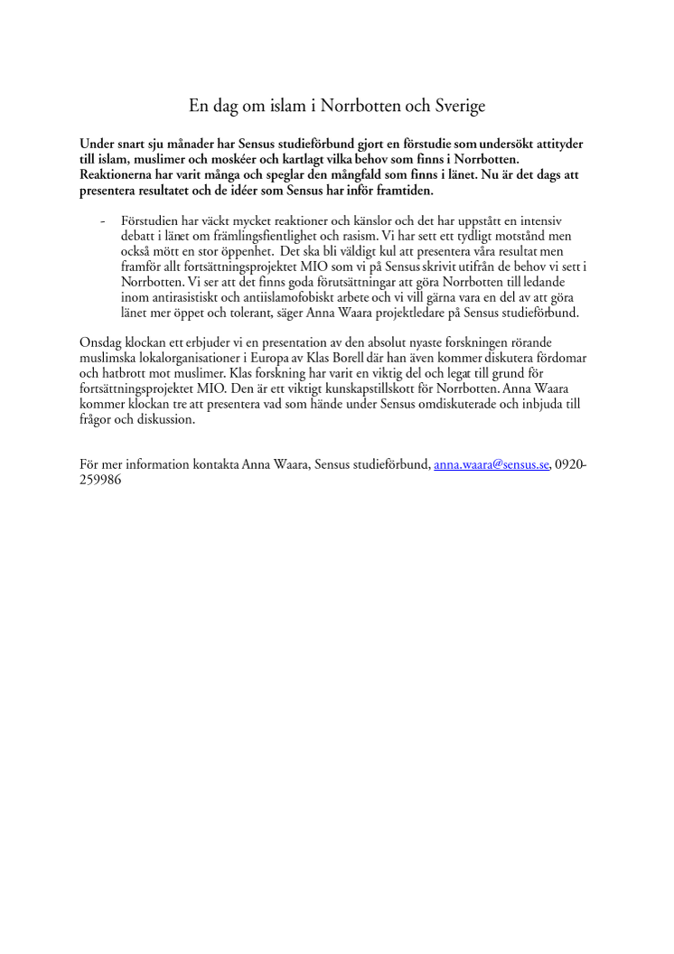 Under snart sju månader har Sensus studieförbund gjort en förstudie som undersökt attityder till islam, muslimer och moskéer och kartlagt vilka behov som finns i Norrbotten. Reaktionerna har varit många och speglar den mångfald som finns i länet. Nu är det dags att presentera resultatet och de idéer som Sensus har inför framtiden.