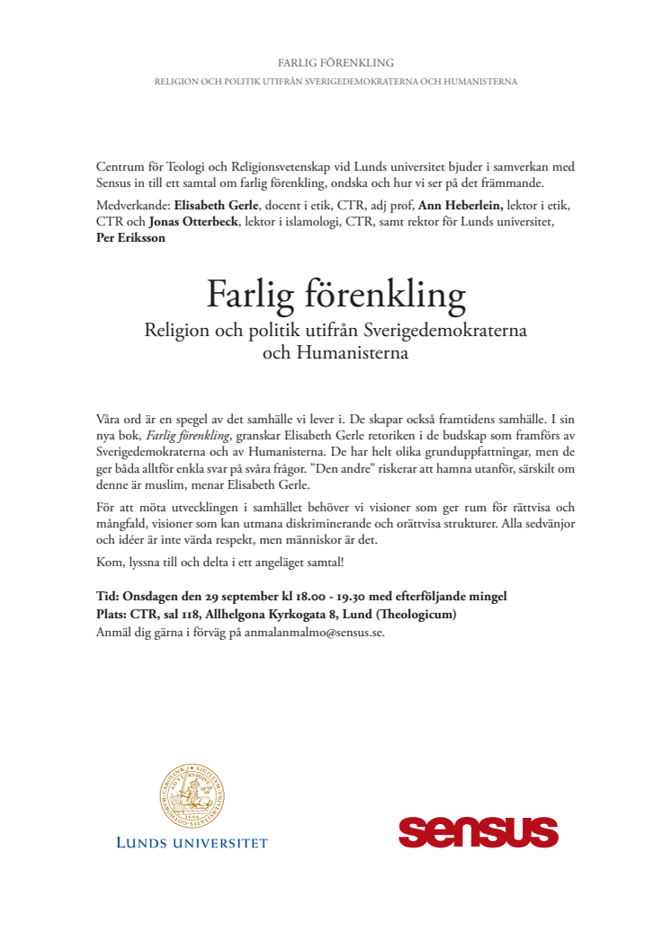 Centrum för Teologi och Religionsvetenskap vid Lunds universitet bjuder i samverkan med Sensus in till ett samtal om farlig förenkling, ondska och hur vi ser på det främmande. Medverkande: Elisabeth Gerle, docent i etik, CTR, adj prof, Ann Heberlein, lektor i etik, CTR och Jonas Otterbeck, lektor i islamologi, CTR, samt rektor för Lunds universitet, Per Eriksson.