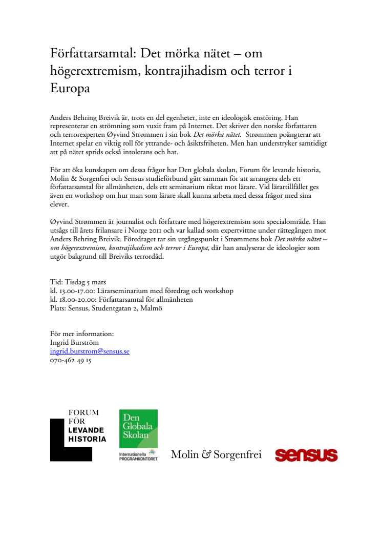 För att öka kunskapen om högerextremism på nätet inbjuder Sensus studieförbund, Den globala skolan, Forum för levande historia och Molin & Sorgenfrei till författarsamtal. Föreläser gör Øyvind Strømmen, journalist och författare med högerextremism som specialområde. Under rättegången mot Anders Behring Breivik var Strømmen kallad som expertvittne.