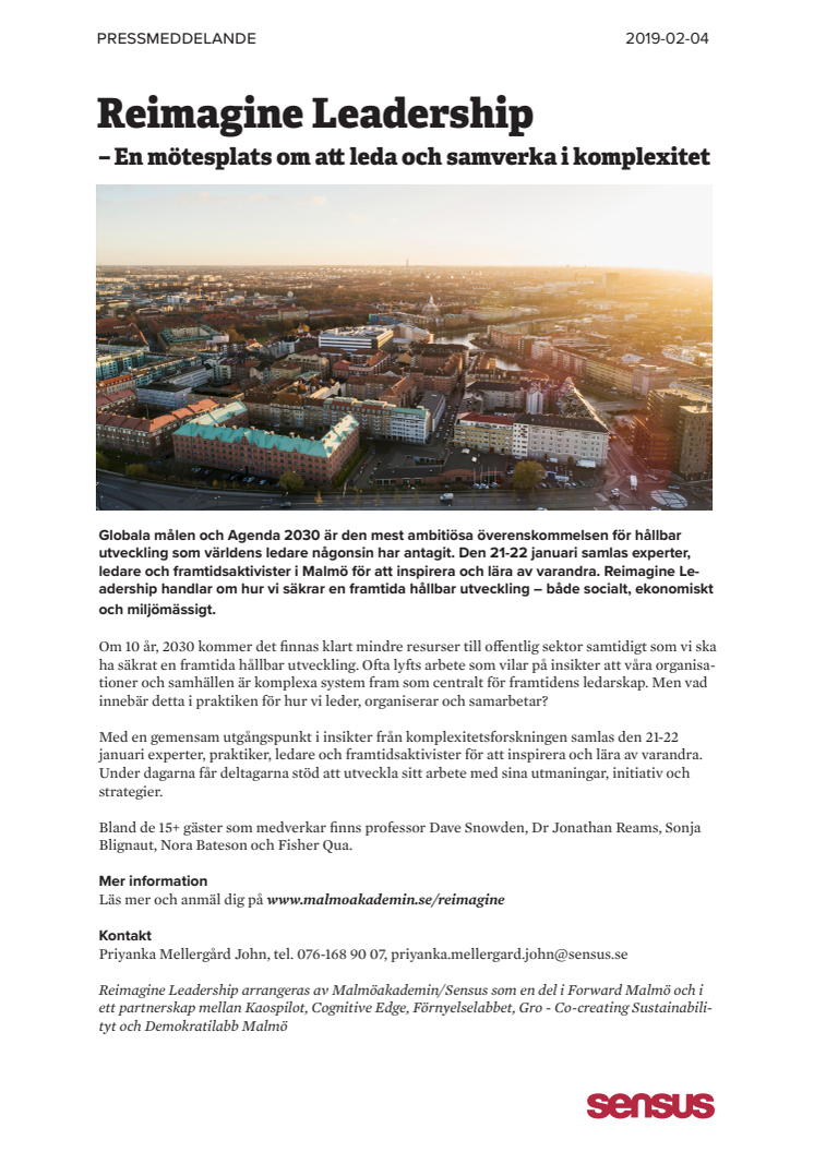 Globala målen och Agenda 2030 är den mest ambitiösa överenskommelsen för hållbar utveckling som världens ledare någonsin har antagit. Den 21-22 januari samlas experter, ledare och framtidsaktivister i Malmö för att inspirera och lära av varandra. Reimagine Leadership handlar om hur vi säkrar en framtida hållbar utveckling – både socialt, ekonomiskt och miljömässigt.