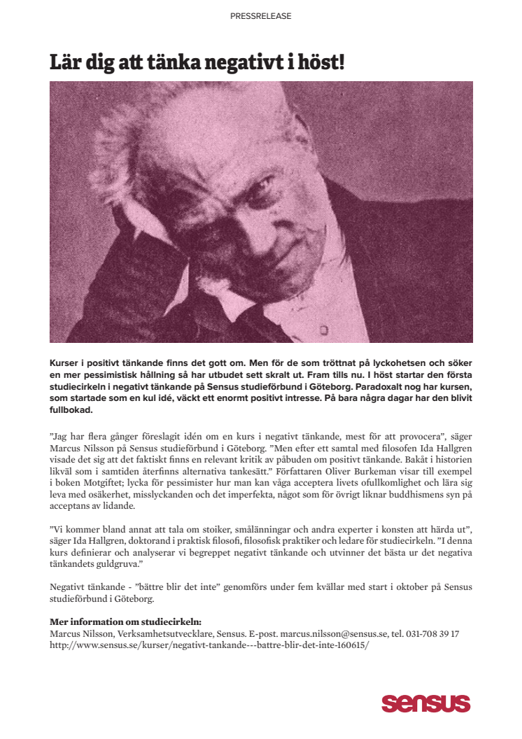 Kurser i positivt tänkande finns det gott om. Men för de som tröttnat på lyckohetsen och söker en mer pessimistisk hållning så har utbudet sett skralt ut. Fram tills nu. I höst startar den första studiecirkeln i negativt tänkande på Sensus i Göteborg. Paradoxalt nog har kursen, som startade som en kul idé, väckt ett enormt positivt intresse. På bara några dagar har den blivit fullbokad.