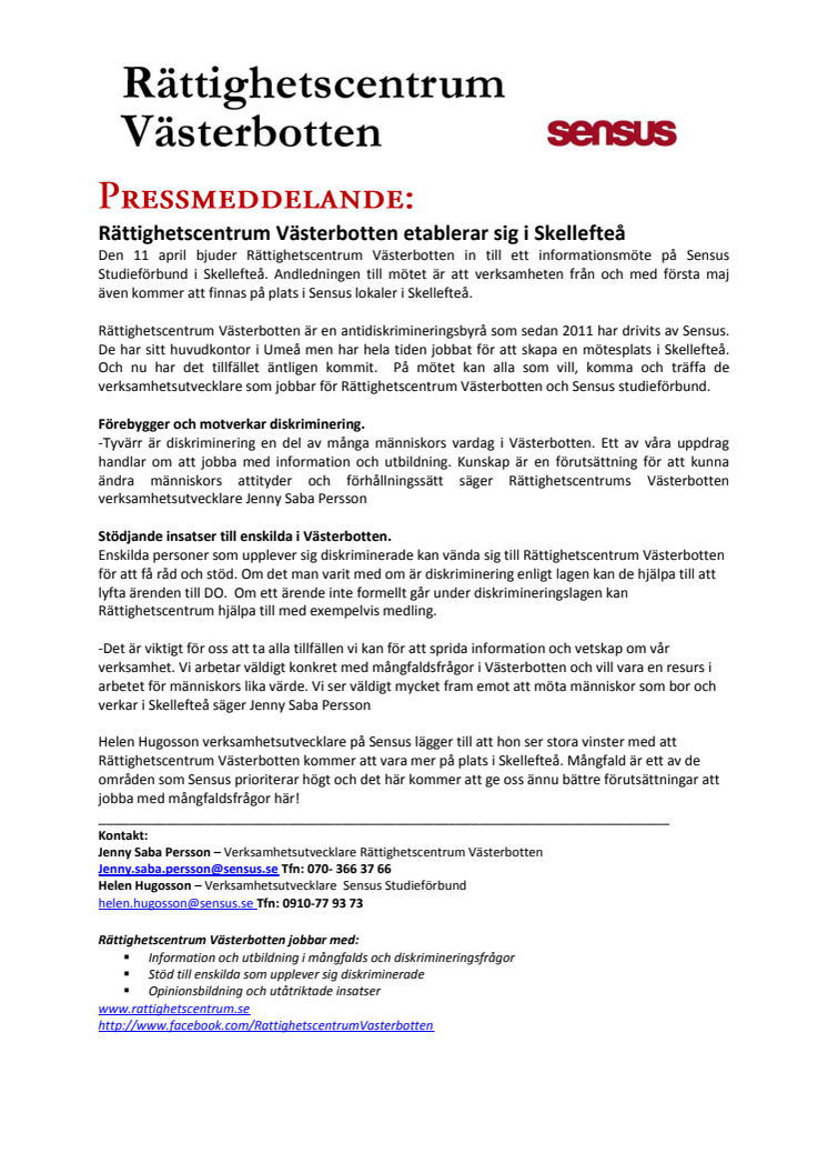 Den 11 april bjuder Rättighetscentrum Västerbotten in till ett informationsmöte på Sensus Studieförbund i Skellefteå. Andledningen till mötet är att verksamheten från och med första maj även kommer att finnas på plats i Sensus lokaler i Skellefteå.