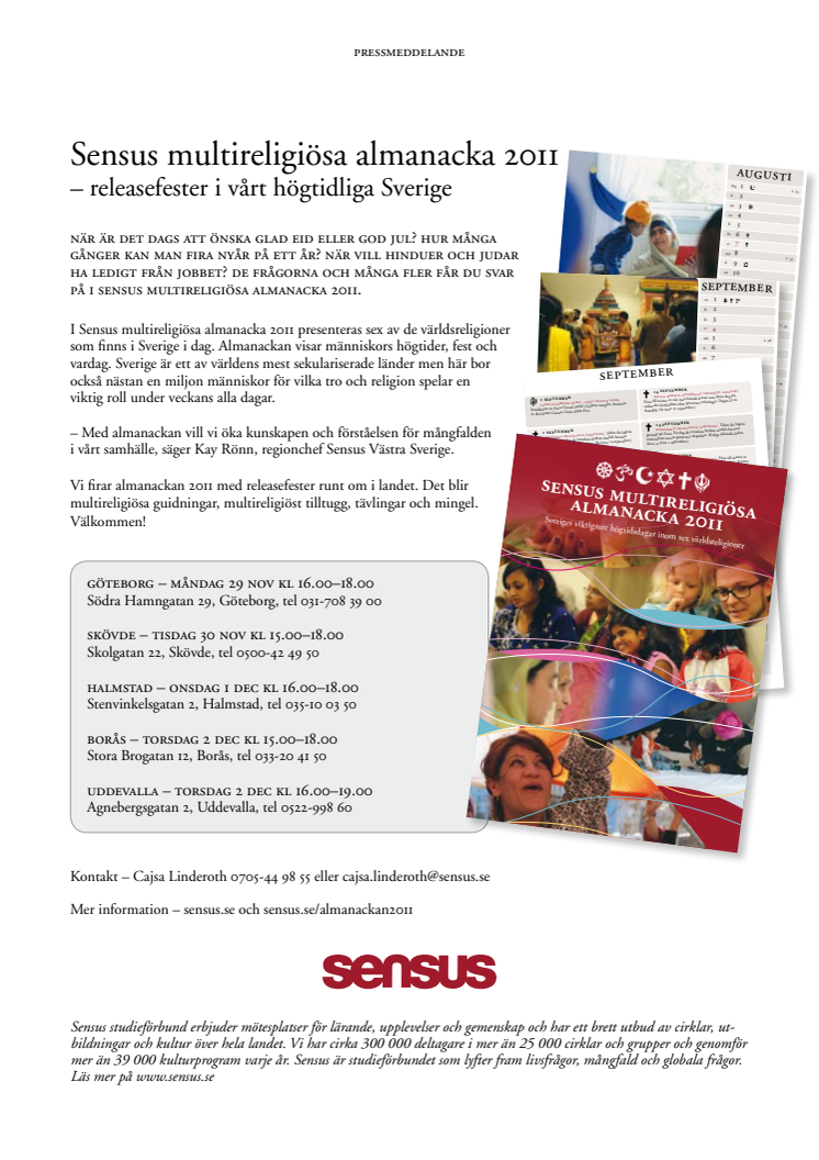 Sensus multireligiösa almanacka 2011 – releasefester i vårt högtidliga Sverige. Göteborg 29 nov, Skövde 30 nov, Halmstad 1 dec, Borås och Uddevalla 2 dec. Vi bjuder på multireligiösa guidningar, multireligiöst tilltugg, tävlingar och mingel. Välkommen!