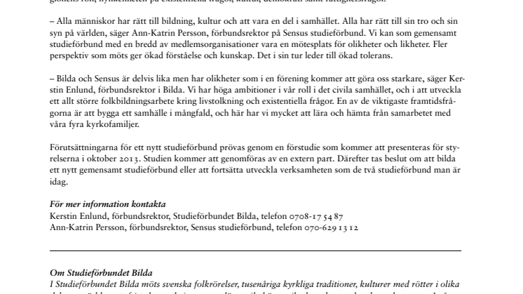 – Bilda och Sensus är delvis lika men har olikheter som i en förening kommer att göra oss starkare, säger Kerstin Enlund, förbundsrektor i Bilda. Vi har höga ambitioner i vår roll i det civila samhället, och i att utveckla ett allt större folkbildningsarbete kring livstolkning och existentiella frågor. En av de viktigaste framtidsfrågorna är att bygga ett samhälle i mångfald, och här har vi mycket att lära och hämta från samarbetet med våra fyra kyrkofamiljer.
