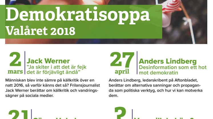2018 är det val i Sverige. Då bjuder arrangörerna in till intressanta föreläsningar och samtal som på olika vis anknyter till valet samt läget i Europa. Demokratisoppa gästas under 2018 av: