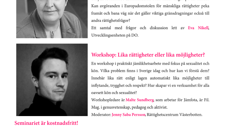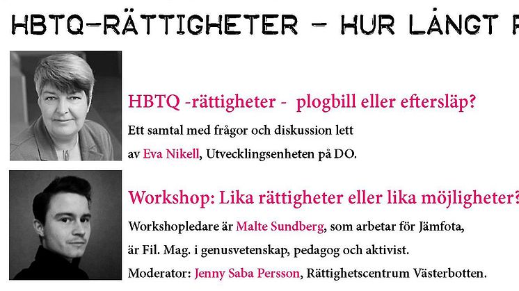 Den 13 feb genomför Rättighetscentrum Västerbotten ett kostnadsfritt seminarium i Skellefteå som fokuserar på HBTQ-personers rättigheter. Det blir föreläsning och workshop i praktiskt jämlikhetsarbete med fokus på sexualitet och kön. Under seminariet medverkar Eva Nikell från Diskrimineringsombudsmannen och Malte Sundberg från Jämfota. Seminariet genomförs i samverkan med Region Västerbotten, Campus Skellefteå, Länsstyrelsen Västerbotten och MR-dagarna.