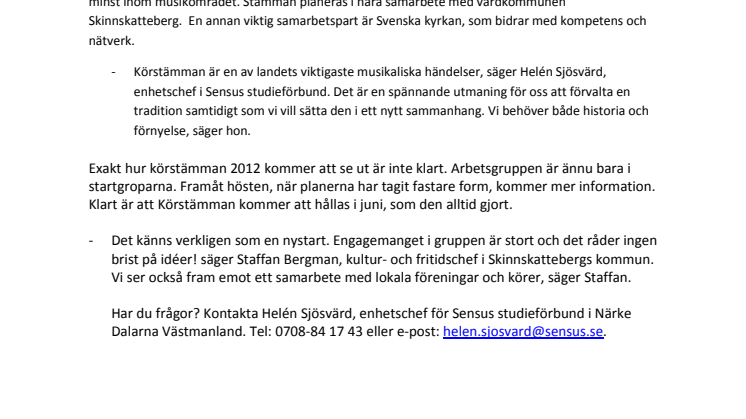- Körstämman är en av landets viktigaste musikaliska händelser, säger Helén Sjösvärd, enhetschef i Sensus studieförbund. Det är en spännande utmaning för oss att förvalta en tradition samtidigt som vi vill sätta den i ett nytt sammanhang. Vi behöver både historia och förnyelse, säger hon.