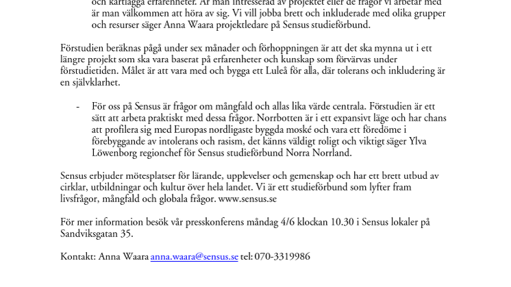 - Den här förstudien är väldigt viktig för att lyckas med att arbeta långsiktigt mot intolerans och rasism i länet. Planerna att bygga en moské i Luleå är positiva och vi vill underlätta det arbetet genom förstudien. Vi vet av erfarenhet från andra platser att rasism och intolerans brukar öka i samband med moskébyggen och vill därför arbeta förebyggande och kartlägga erfarenheter. Är man intresserad av projektet eller de frågor vi arbetar med är man välkommen att höra av sig. Vi vill jobba brett och inkluderade med olika grupper och resurser säger Anna Waara projektledare på Sensus studieförbund.