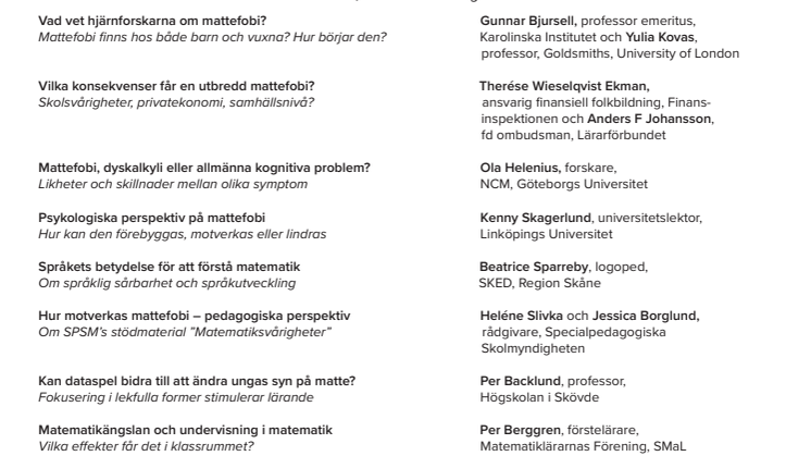 Mot den bakgrunden har vi samlat forskare och praktiker till ett webbinarium fredagen den 7 maj för att belysa mattefobin från olika perspektiv. Budskapet är att det går att arbeta förebyggande, men också att mattefobi i likhet med andra fobier både kan lindras och botas och att insikten om detta nu måste få synbara genomslag både i skolvärlden och i folkhälsoarbetet.