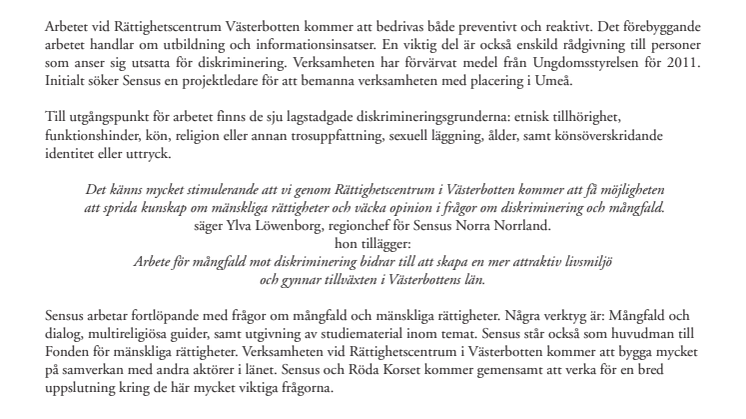 "Det känns mycket stimulerande att vi genom Rättighetscentrum i Västerbotten kommer att få möjligheten att sprida kunskap om mänskliga rättigheter och väcka opinion i frågor om diskriminering och mångfald." säger Ylva Löwenborg, regionchef för Sensus Norra Norrland, hon tillägger: