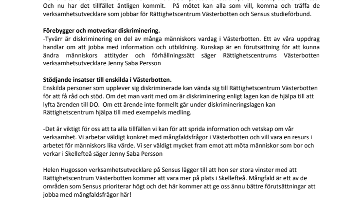Helen Hugosson verksamhetsutvecklare på Sensus lägger till att hon ser stora vinster med att Rättighetscentrum Västerbotten kommer att vara mer på plats i Skellefteå. Mångfald är ett av de områden som Sensus prioriterar högt och det här kommer att ge oss ännu bättre förutsättningar att jobba med mångfaldsfrågor här!