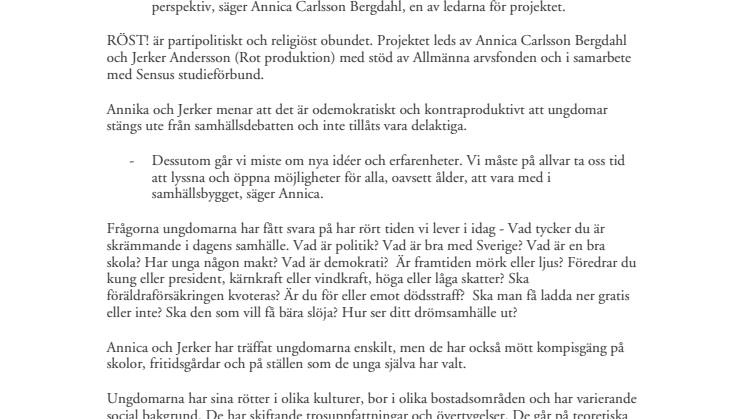 RÖST! är partipolitiskt och religiöst obundet. Projektet leds av Annica Carlsson Bergdahl och Jerker Andersson (Rot produktion) med stöd av Allmänna arvsfonden och i samarbete med Sensus studieförbund.